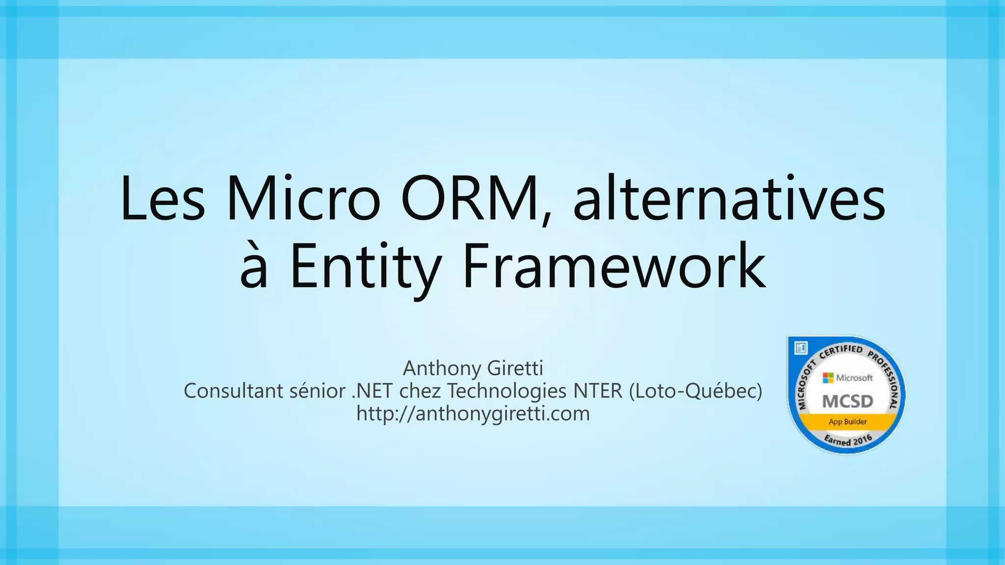 Le document présente une comparaison entre Entity Framework et plusieurs alternatives de micro ORM, soulignant les avantages et inconvénients d'Entity Framework, ainsi que les caractéristiques des différentes options. Parmi les alternatives discutées, Dapper, NPoco et OrmLite se distinguent par leurs performances, syntaxe et fonctionnalités. Le document conclut que Dapper est le plus populaire pour ses performances, tandis qu'OrmLite et NPoco méritent également d'être considérés.