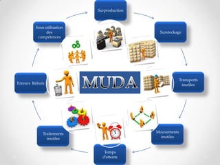 Le document traite des gaspillages dans le contexte du lean management, en identifiant trois catégories principales : les muda (gaspillages identifiables), les muri (excès et déraisonnable) et les mura (variabilité). Il décrit divers exemples de gaspillages tels que la surproduction, le surstockage, et inefficacités dans les mouvements et traitements, tout en soulignant l'importance d'observer et d'analyser les processus pour les éliminer. Enfin, il évoque l'importance de la standardisation et du juste à temps pour combattre ces gaspillages.