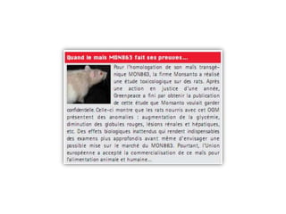 Le document critique les organismes génétiquement modifiés (OGM) en soulignant les risques potentiels pour la santé humaine et l'environnement, ainsi que le manque de traçabilité concernant leur consommation. Il rappelle que les cultures OGM contaminent inévitablement les cultures non-OGM et qu'il existe des promesses non tenues concernant leurs avantages. Enfin, il insiste sur la nécessité d'une recherche publique accrue pour l'agriculture respectueuse de l'environnement plutôt que de se fier aux entreprises privées.