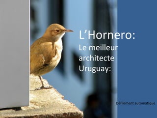 Le document présente l'obsession d'un résident uruguayen pour les nids d'horneros, des oiseaux architectes, en prenant plus de 600 photos de l'un construit près de chez lui. Il partage ces images en ligne pour sensibiliser sur l'environnement, malgré son absence de formation en photographie. Le nid a été construit en deux mois, avec un travail acharné des oiseaux, qui ne travaillent jamais le dimanche.