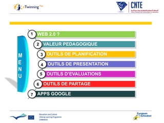Le document présente divers outils Web 2.0 à valeur pédagogique, adaptés à différents modèles d'enseignement, et souligne leur importance pour le développement de compétences essentielles. Il décrit des outils pour la planification, la présentation, l'évaluation, et le partage, accompagnés de sites web et de tutoriels. Ces outils sont conçus pour faciliter la collaboration et l'interaction dans un cadre éducatif.