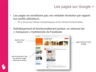 Les pages professionnelles sur Google+ sont similaires aux profils utilisateurs de Facebook, offrant des fonctionnalités telles que l'interaction et le partage de contenu, mais manquent de personnalisation et de statistiques. Bien qu'elles soient orientées vers la relation client et bénéficient d'un meilleur référencement naturel via Google, elles souffrent de limitations, notamment d'un administrateur unique et de l'absence de fonctionnalités comme les concours. Des améliorations sont en cours, mais pour l'instant, les entreprises sont encouragées à utiliser Google+ pour optimiser leur présence en ligne et interagir avec un public professionnel.