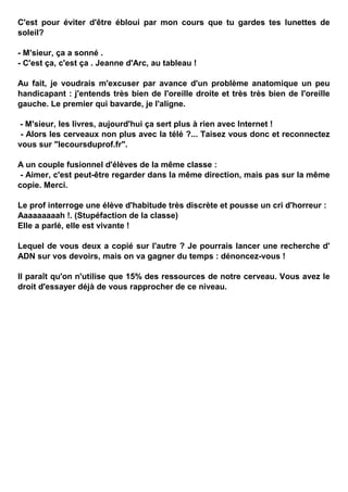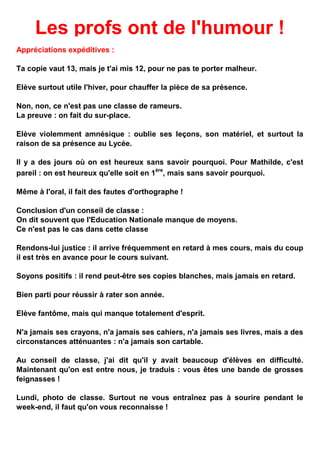Le document présente une série d'appréciations humoristiques et sarcastiques d'un professeur sur ses élèves, illustrant leur comportement en classe. Les remarques mettent en lumière les retards, l'oubli de matériel et l'absence d'effort de nombreux élèves, tout en soulignant une atmosphère comique dans l'enseignement. Malgré un ton critique, le professeur cherche à maintenir une ambiance positive et engageante.