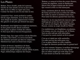 Le document explore l'oeuvre de Charles Baudelaire, particulièrement son poème 'Les Fleurs du Mal', et évoque différents artistes comme Rubens, Léonard de Vinci, Rembrandt et Michel-Ange, en utilisant des métaphores et des imageries riches. En traversant des thèmes de mélancolie, de vie et de mort, il décrit des scènes à la fois paradisiaques et cauchemardesques, mêlant la beauté et la souffrance. Chaque quatrain illustre l'interaction entre les œuvres d'art et l'expérience humaine, tout en questionnant la dignité et l'éternité.