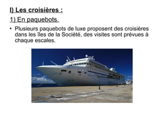 Le tourisme est la principale source de revenus de la Polynésie française, générant 42,5 milliards de francs pacifiques en 2008. Les croisières en paquebots de luxe et la location de voiliers à Raiatea sont des activités clés avec un potentiel de croissance. La Polynésie est également une escale populaire pour les plaisanciers effectuant un tour du monde, bien qu'il faille prendre des précautions contre les vols dans certaines zones.