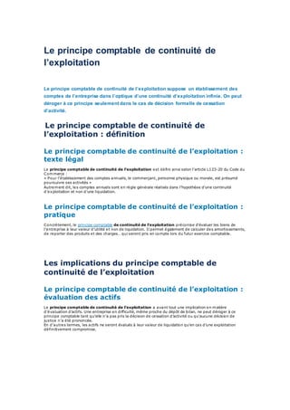 Le principe comptable de continuité de l'exploitation suppose que les comptes d'une entreprise soient établis dans l'hypothèse d'une exploitation continue, sauf en cas de cessation d'activité formelle. Cela impacte l'évaluation des actifs, qui doivent être pris à leur valeur d'utilité, et implique également le respect de la permanence des méthodes dans la comptabilité. D'autres principes comme le coût historique et la prudence doivent également être respectés pour garantir la fiabilité des états financiers.