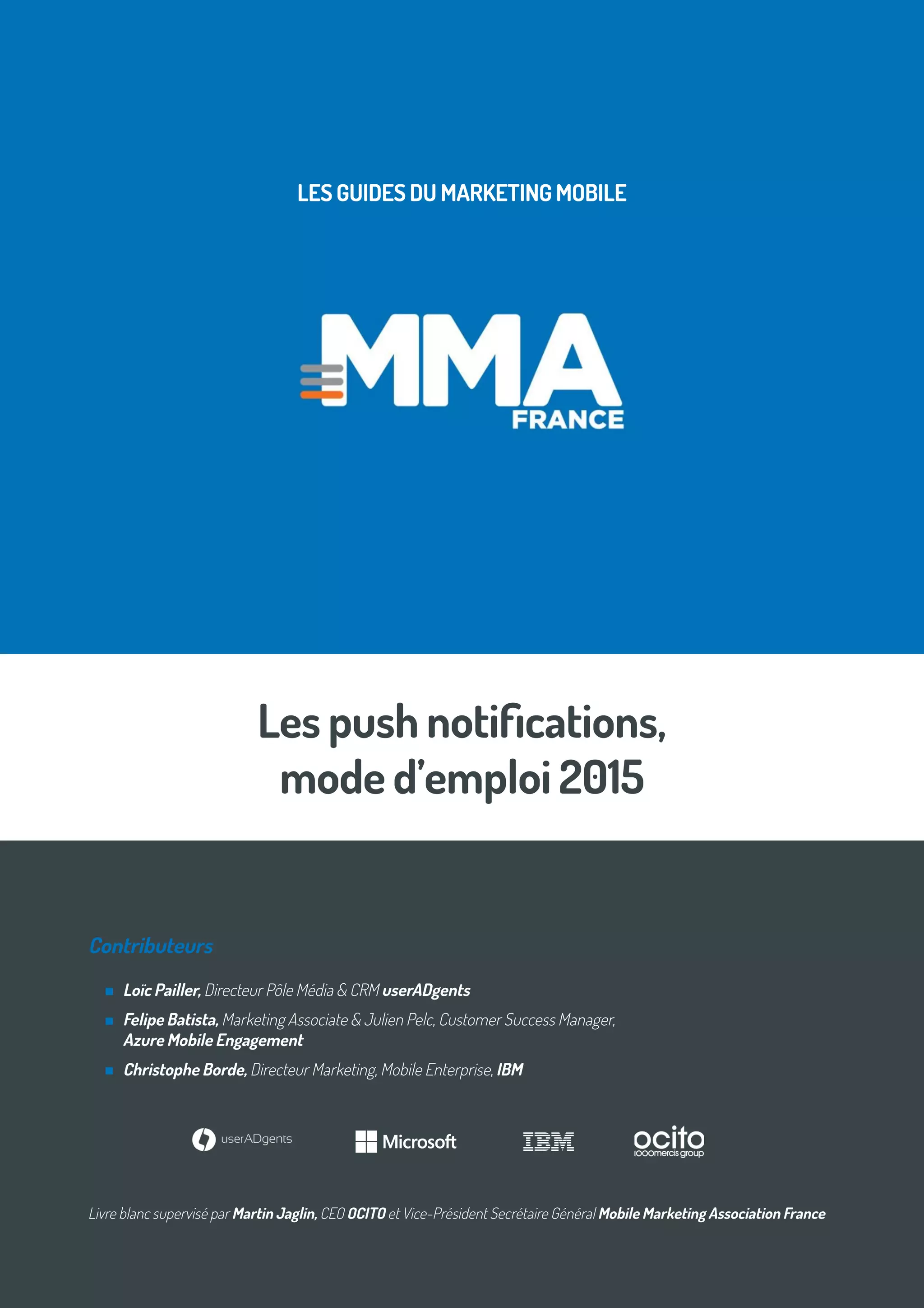 Ce document est un guide sur l'utilisation des push notifications dans le marketing mobile, soulignant leur importance croissante et les étapes clés pour les intégrer efficacement dans une stratégie CRM. Il aborde également le cadre juridique entourant ces notifications, avec un focus sur les mécanismes d'opt-in et d'opt-out sur différentes plateformes. En conclusion, il met en avant la nécessité d'une approche centrée sur le client pour optimiser la communication à travers les push notifications.