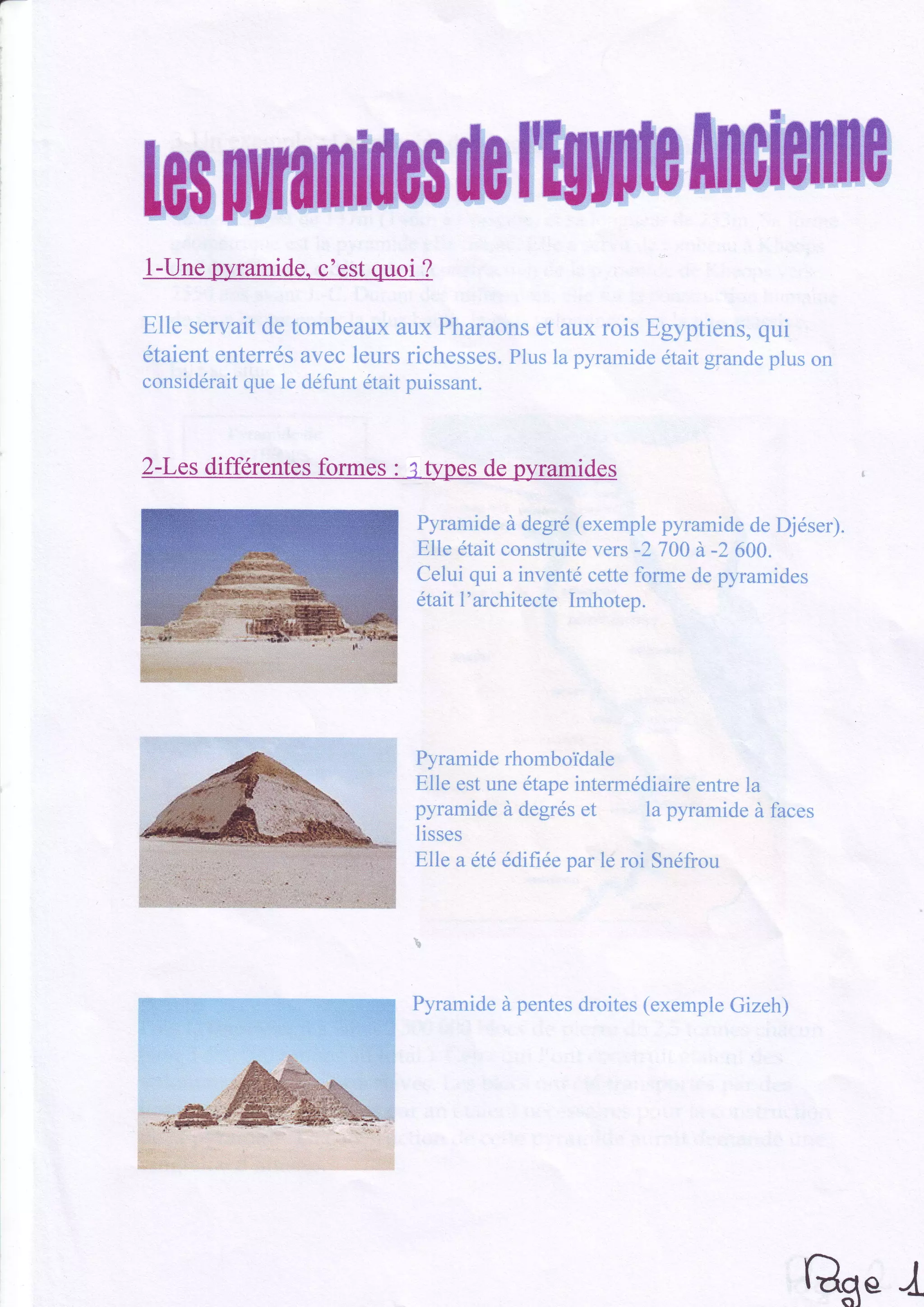 Les pyramides égyptiennes, notamment celle de Kheops, servaient de tombeaux pour les pharaons, reflétant leur puissance et richesses. La pyramide de Kheops, construite vers 2550 av. J.-C., est la plus haute et volumineuse, nécessitant 2,3 millions de blocs de pierre et 20 ans de construction, réalisée par des volontaires. D'autres pyramides, comme celle de Khephren, témoignent également de l'ingéniosité architecturale de l'époque.