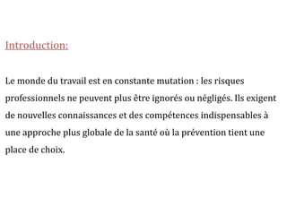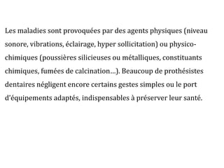 Le document traite des nombreux risques professionnels auxquels sont confrontés les prothésistes dentaires, notamment les risques infectieux, physiques, chimiques et toxiques, ainsi que les risques d'incendie. Il souligne l'importance de la prévention par des mesures telles que la propreté des espaces de travail, le port d'équipements de protection, et des bonnes conditions de travail. La formation et l'information des travailleurs sont essentielles pour minimiser les accidents et préserver leur santé.