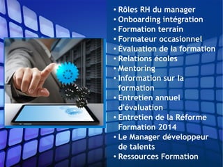 Le document présente les rôles clés du manager dans la formation des salariés, y compris l'onboarding, la formation terrain, l'évaluation des formations, le tutorat et le mentoring. Il souligne l'importance de la formation selon le code du travail et la nécessité pour le manager de contribuer activement au développement de talents au sein de son équipe. Les exigences de la réforme de la formation professionnelle de 2014 sont également détaillées, mettant en exergue les droits d'information des salariés et les engagements des employeurs.