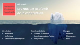 Le document explore les dynamiques profondes de la coopération en mettant en évidence l'importance de passer de la collaboration à la coopération, en intégrant des facteurs explicites et implicites tels que les aspects psychologiques et sociologiques. Il souligne également la nécessité d'apprendre à comprendre et à reproduire les compétences clés mobilisées par les acteurs de la coopération pour progresser et innover. Enfin, il affirme que la transformation personnelle est essentielle pour initier des changements collectifs durables.