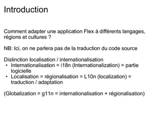 Le document traite des stratégies pour localiser une application Flex d'Adobe en tenant compte de la diversité linguistique, culturelle et régionale. Il distingue l'internationalisation (i18n) et la localisation (l10n) tout en présentant des méthodes de gestion des données métier et d'interface, utilisant des resource bundles pour adapter le contenu. Les méthodes d'implémentation incluent la compilation statique et dynamique, avec des recommandations pour une meilleure gestion et mise à jour des traductions au sein de l'application.