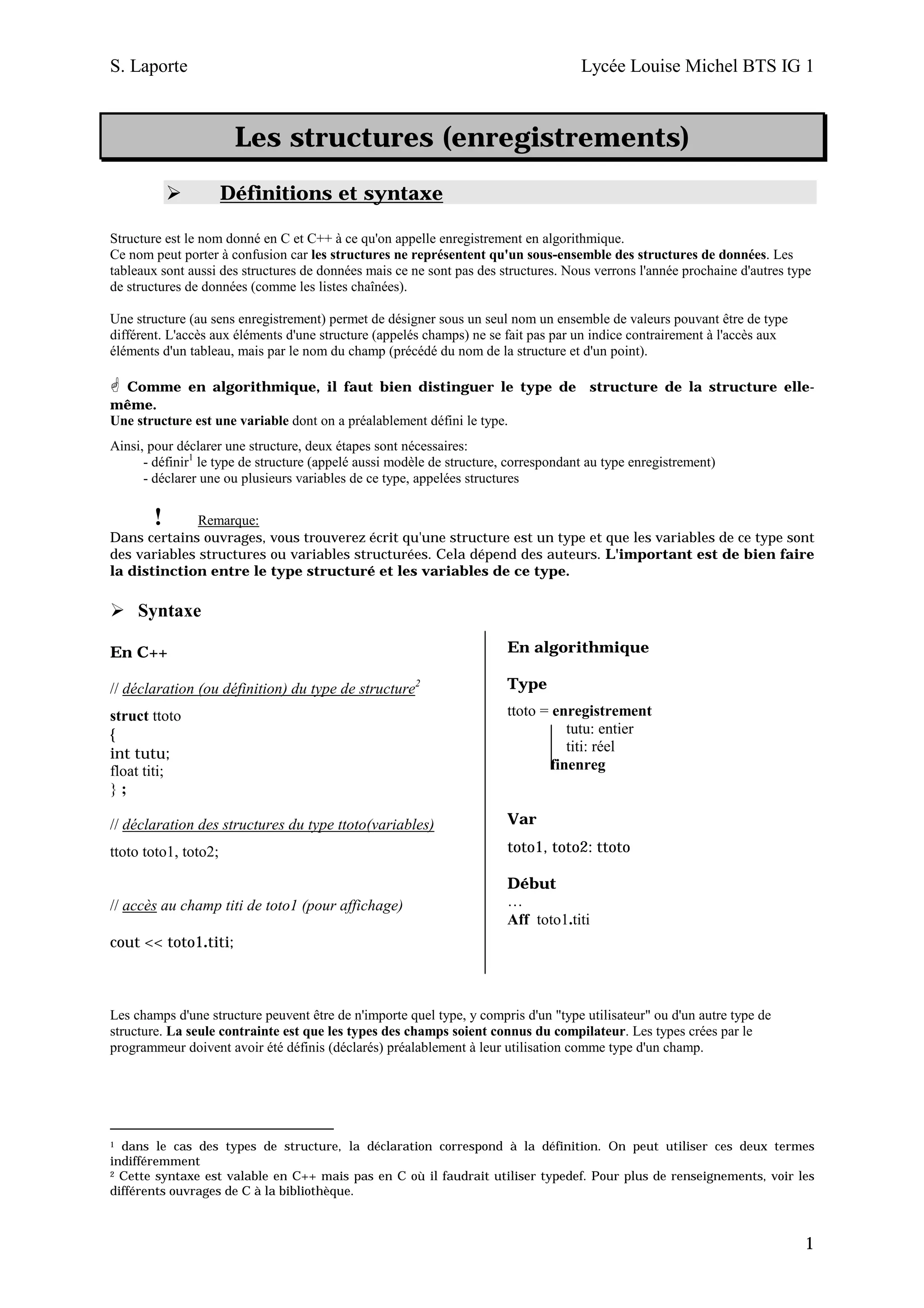 Le document présente les concepts des structures en C et C++, qui sont des types permettant de regrouper des valeurs de types différents sous un même nom. Il explique la syntaxe pour déclarer des structures, l'accès à leurs champs, ainsi que le passage de structures en tant que paramètres de fonctions. Des exemples pratiques et des applications illustrent l'utilisation des structures, y compris la gestion des données sur des clients et des joueurs de rugby.