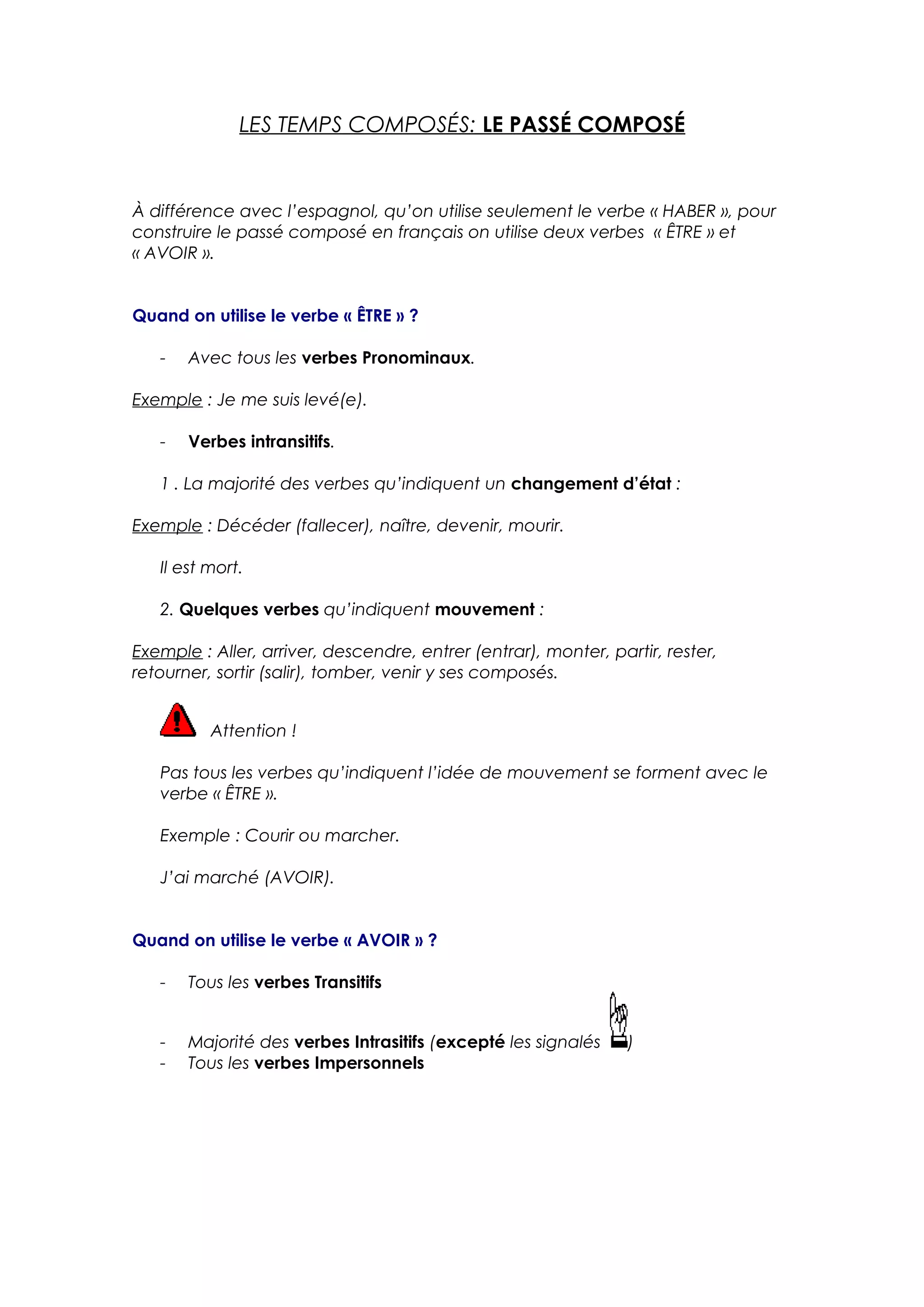 Le passé composé en français utilise 'être' et 'avoir' en fonction du type de verbe. 'Être' est utilisé avec les verbes pronominaux et certains verbes intransitifs de mouvement, tandis qu' 'avoir' est employé pour la majorité des autres verbes transitifs et intransitifs. L'accord du participe passé dépend de l'auxiliaire utilisé, avec des règles spécifiques selon la position du complément d'objet direct ou la nature du sujet.