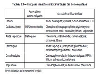 Le séminaire aborde les thymorégulateurs utilisés dans le traitement des troubles bipolaires, incluant le lithium, les anticonvulsivants et les antipsychotiques atypiques. Il traite des mécanismes d'action, des données cliniques, des posologies, des indications et des contre-indications associées à ces médicaments. L'importance d'un suivi rigoureux et des facteurs modifiant la pharmacocinétique du lithium sont également soulignés.