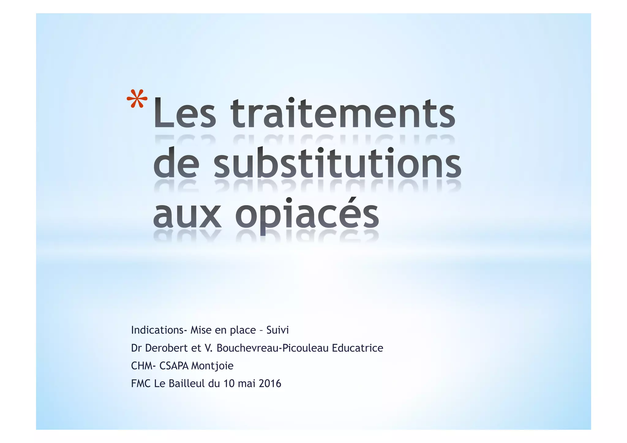 Ce document traite des traitements de substitution aux opiacés, mettant l'accent sur l'intégration médico-psycho-sociale pour aider les usagers à gérer leur dépendance et améliorer leur qualité de vie. Il décrit les objectifs des usagers et des soignants, ainsi que les modalités de prescription et de suivi, y compris les précautions et contre-indications. Les acteurs impliqués, notamment médecins et pharmaciens, doivent collaborer pour assurer un accompagnement adéquat et prévenir les risques associés aux traitements.