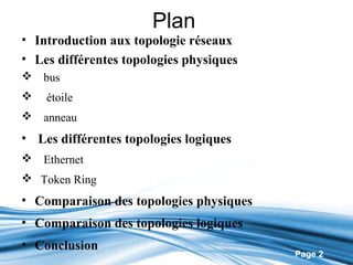 Ce document présente les différentes topologies de réseau, notamment les topologies physiques (bus, étoile, anneau) et logiques (Ethernet, Token Ring), en détaillant leurs caractéristiques, avantages et inconvénients. Il souligne que la compréhension d'une topologie de réseau nécessite l'évaluation de l'interaction entre sa topologie physique et logique. Enfin, il fournit des références pour approfondir le sujet.