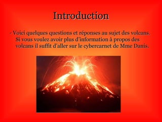 Le document présente des informations essentielles sur les volcans, expliquant leur composition, leur formation et les différents types existants. Il aborde également les risques associés aux volcans et cite des exemples de volcans célèbres. Enfin, l'auteur partage ses conclusions sur la diversité des volcans et leurs similarités avec des montagnes.