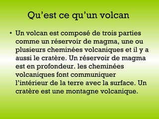 Un volcan est composé d'un réservoir de magma, de cheminées volcaniques et d'un cratère. 95% des volcans se forment le long des plaques tectoniques où la croûte terrestre se fissure, et les principaux types de volcans incluent le volcan hawaïen, strombolien, vulcanien et péléen. Les risques associés à l'activité volcanique comprennent des brûlures par la lave, des intoxications dues aux gaz et la possiblité d'éruptions dangereuses.