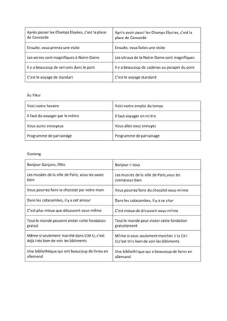 Le document décrit une visite à Paris, incluant des informations sur des attractions comme la Tour Eiffel, le Louvre, Disneyland, et les catacombes. Il évoque également des conseils sur les transports en commun et des activités à faire, comme la fabrication de chocolat. Les lieux sont mis en valeur pour leur beauté et leur accessibilité.
