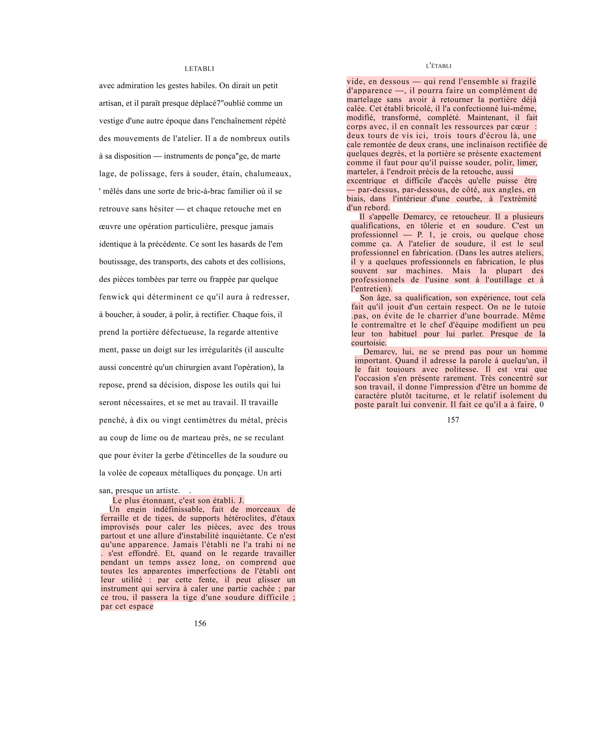 Le document décrit le travail d'un retoucheur nommé Demarcy, qui est un artisan spécialisé dans la tôlerie et la soudure, et qui utilise un établi fait de pièces de ferraille, apparemment fragile mais toujours efficace. À l'approche de changements d'organisation dans son atelier, l'atmosphère devient tendue, avec des discussions sur des statistiques et des transformatioms dans la main-d'œuvre. Le retoucheur, respecté pour son expertise, continue de travailler avec précision malgré les menaces d'efficacité liées à la rationalisation.