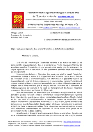 La FELCO exprime une vive préoccupation concernant l'article 27 bis de la loi d'orientation sur l'école, qui impose des restrictions sur l'usage des langues régionales, en particulier l'occitan, par les enseignants. Elle souligne que cet article pourrait nuire à l'enseignement des langues régionales et créer des obstacles administratifs dissuasifs, allant à l'encontre de la promotion de la diversité culturelle. La FELCO demande la suppression de cet article pour éviter des complications et préserver l'enseignement des langues régionales en France.