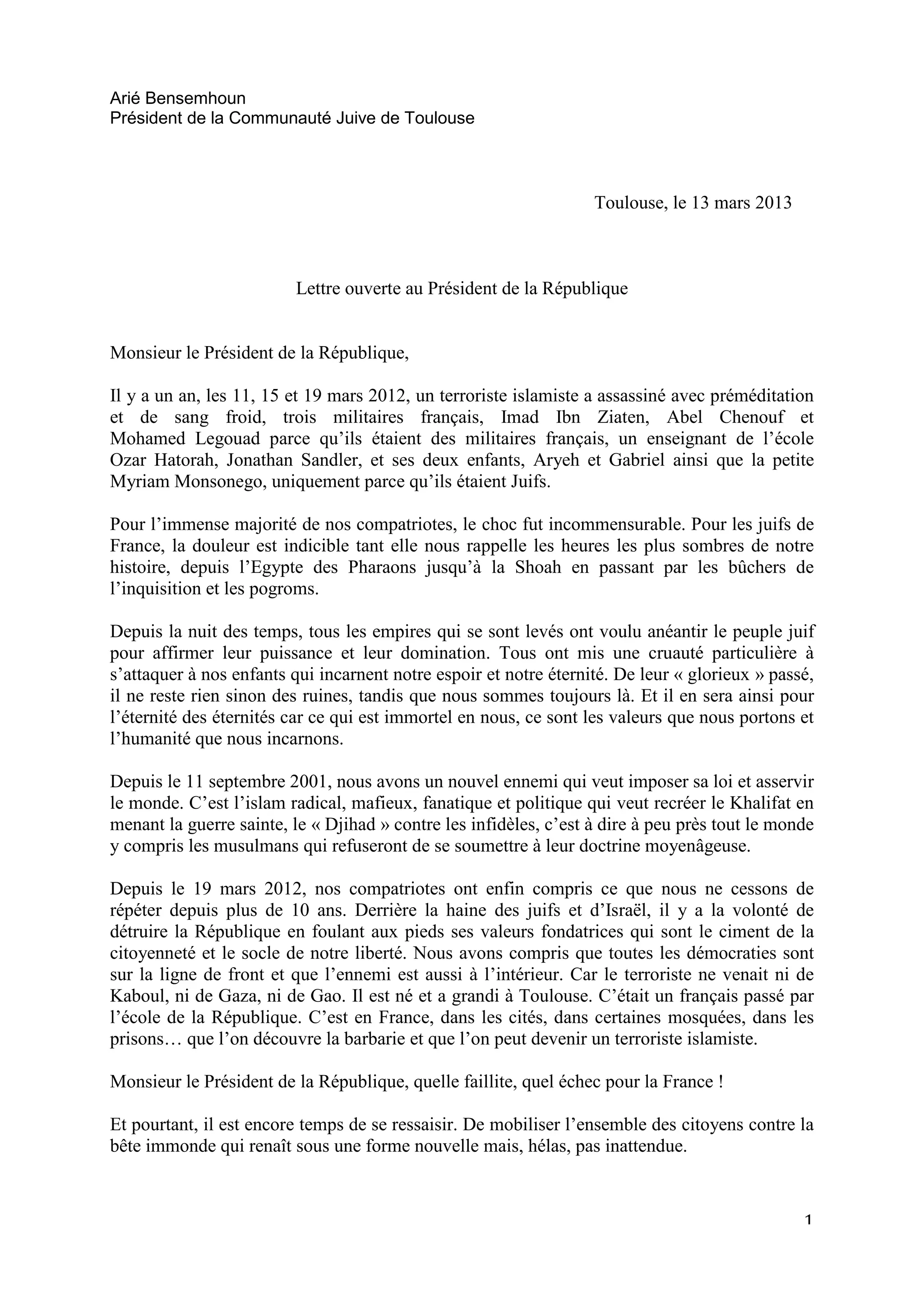 Arié Bensemhoun, président de la communauté juive de Toulouse, écrit une lettre ouverte au président de la République, évoquant les meurtres de 2012 qui ont touché la communauté juive et alertant sur la montée de l'islam radical. Il appelle à un combat résolu contre le terrorisme, évoquant des menaces telles que le Hezbollah et l'Iran, tout en soulignant l'importance de défendre les valeurs démocratiques. Il termine en exprimant le souhait de voir un futur où les enfants juifs n'auront plus à craindre pour leur vie à cause de leur identité.
