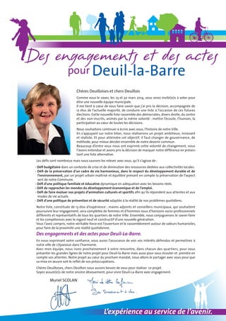 Muriel Scolan, accompagnée de 12 élus, présente une liste pour les élections municipales des 23 et 30 mars 2014, visant à bâtir un projet centré sur l'écoute, l'humain et la participation citoyenne. La liste mettra l'accent sur plusieurs défis, y compris le budget, le développement durable, la politique familiale, ainsi que la culture et la sécurité. Scolan et son équipe s'engagent à rencontrer les habitants pour partager leur projet et recueillir leurs attentes.