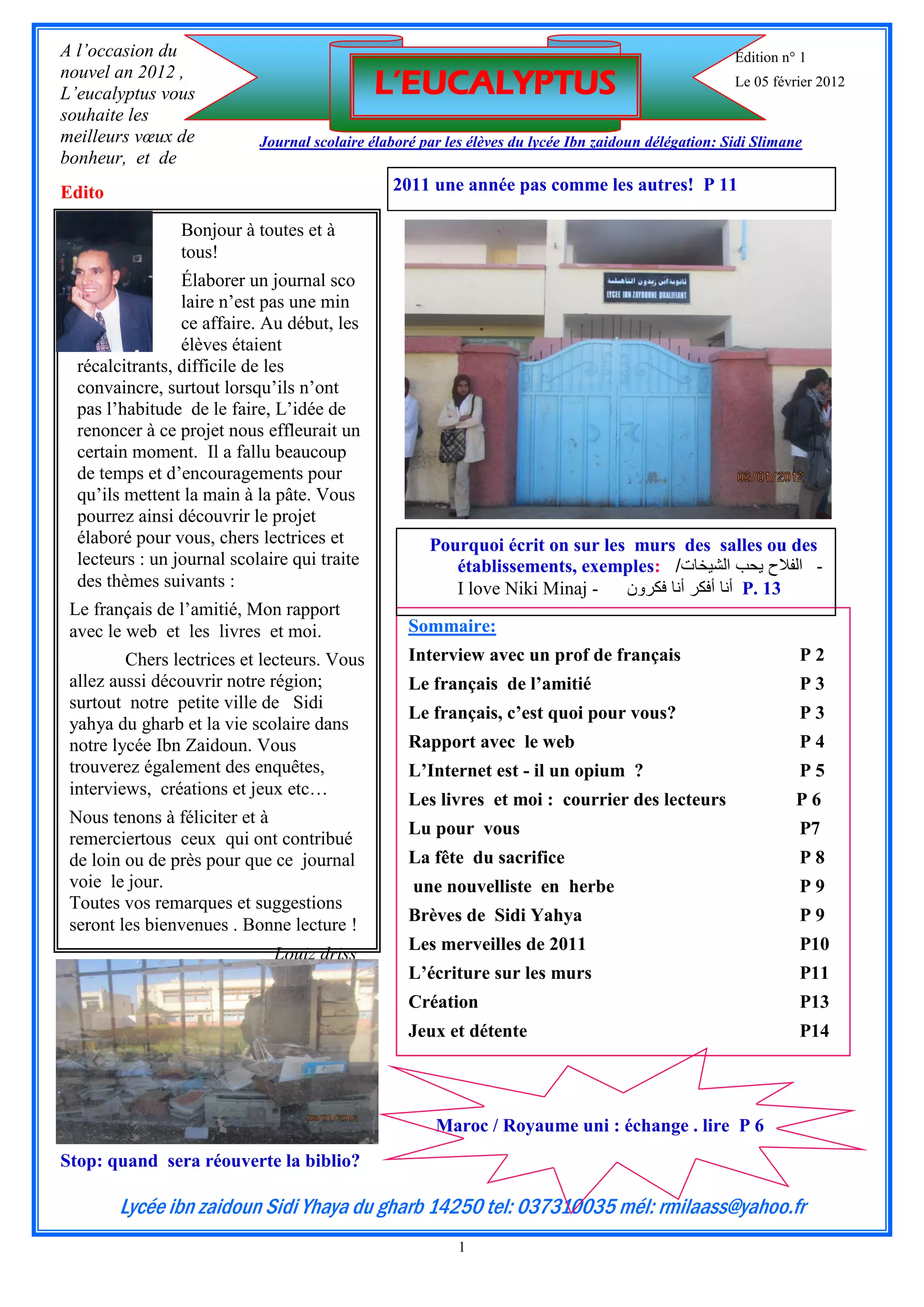 Le document présente la première édition du journal scolaire 'L'Eucalyptus' du lycée Ibn Zaidoun, contenant des articles sur divers thèmes, des interviews de professeurs, et une réflexion sur l'enseignement du français au Maroc. Les élèves abordent des sujets variés tels que leur rapport à la technologie, la lecture, et la situation des personnes handicapées au Maroc. Le journal vise à encourager l'engagement des élèves et à promouvoir la culture locale à travers l'écriture.