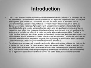 Le document traite de l'euthanasie, son statut légal en France où aucune loi ne l'autorise encore, et les différentes opinions et débats qu'elle suscite dans la société. Il aborde aussi des cas marquants comme celui de Vincent Humbert et la divergence des avis politiques, ainsi que la situation de l'euthanasie dans le monde. Enfin, il note que malgré l'interdiction de l'euthanasie active, des discussions continuent pour garantir la dignité des patients en fin de vie.
