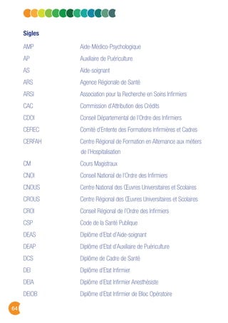 Le document présente un lexique des sigles et des textes réglementaires liés aux professionnels de santé, notamment les infirmiers et les aides-soignants en France. Il détaille les compétences, l'organisation des études, ainsi que les textes législatifs régissant l'exercice de la profession. Des références à des arrêtés, décrets et circulaires précisent les conditions de formation et les réglementations en vigueur.