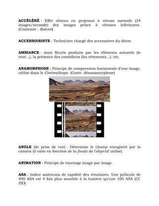 Le document est un lexique du cinéma détaillant des termes techniques et leur définition, allant de l'accéléré, du ralenti, à des concepts comme le champ, le cadre et le montage. Il couvre divers rôles, techniques de tournage, et procédés de production utilisés dans le milieu cinématographique. Ce lexique sert de référence utile pour comprendre les éléments essentiels et les procédures du cinéma.