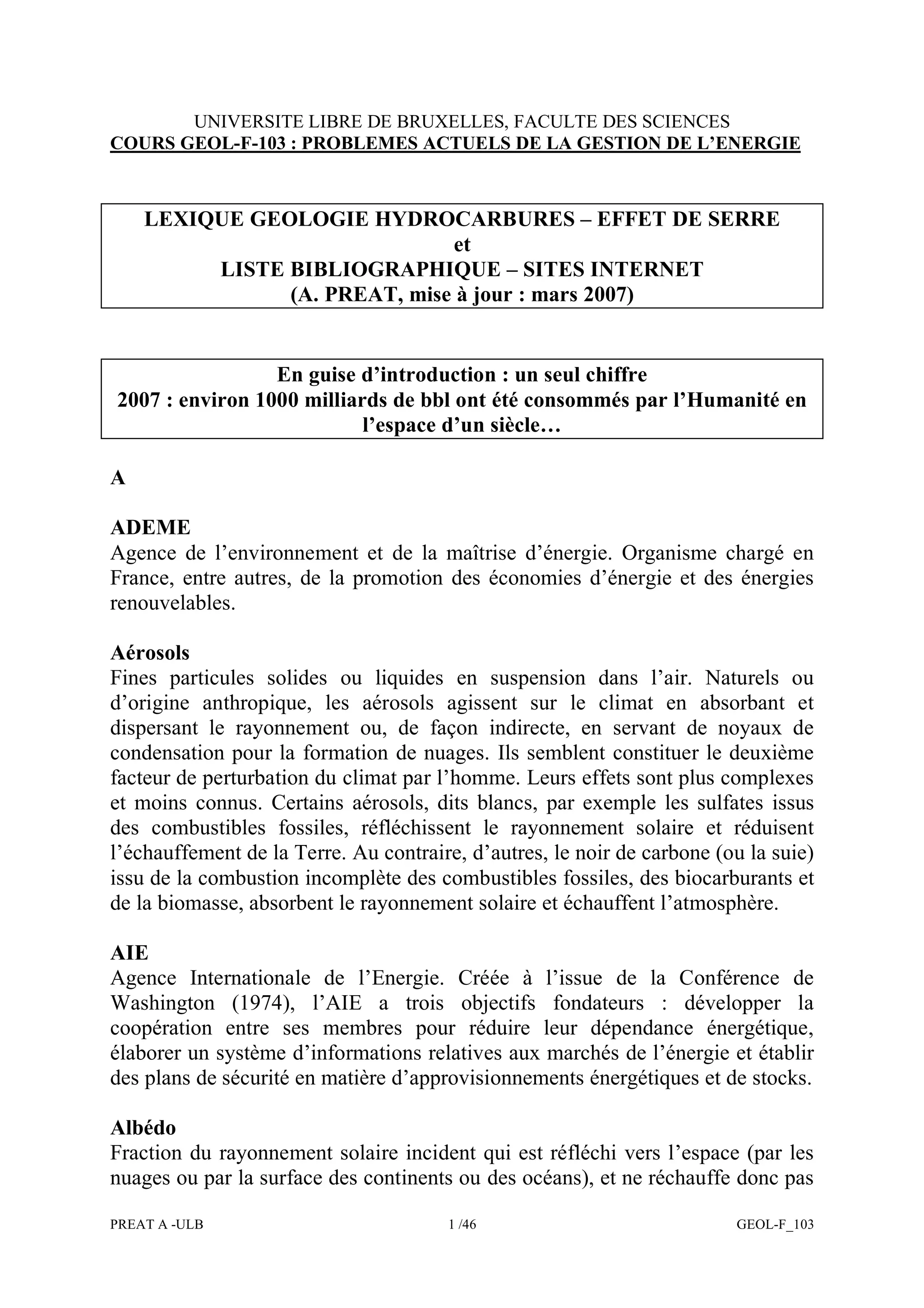 Le document traite des problématiques actuelles liées à la gestion de l'énergie, notamment l'impact des hydrocarbures et des aérosols sur le climat. Il aborde aussi les biocarburants et leur potentiel pour remplacer une partie des combustibles fossiles, tout en soulignant les défis associés à leur production. Enfin, il fournit un glossaire technique sur des termes géologiques et énergétiques pertinents pour la compréhension des enjeux énergétiques contemporains.