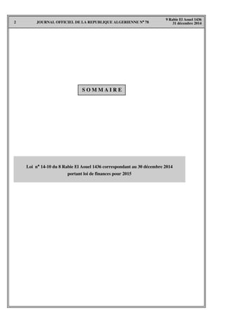 Le document présente la loi de finances pour 2015 en Algérie, promulguée par le président de la république et adoptée par le parlement. Il détaille les modifications apportées aux lois fiscales, notamment les impôts directs et indirects, ainsi que les exonérations pour les jeunes promoteurs d'activités. Des dispositions concernant l'imposition forfaitaire unique et les réductions fiscales pour certaines wilayas sont également incluses.