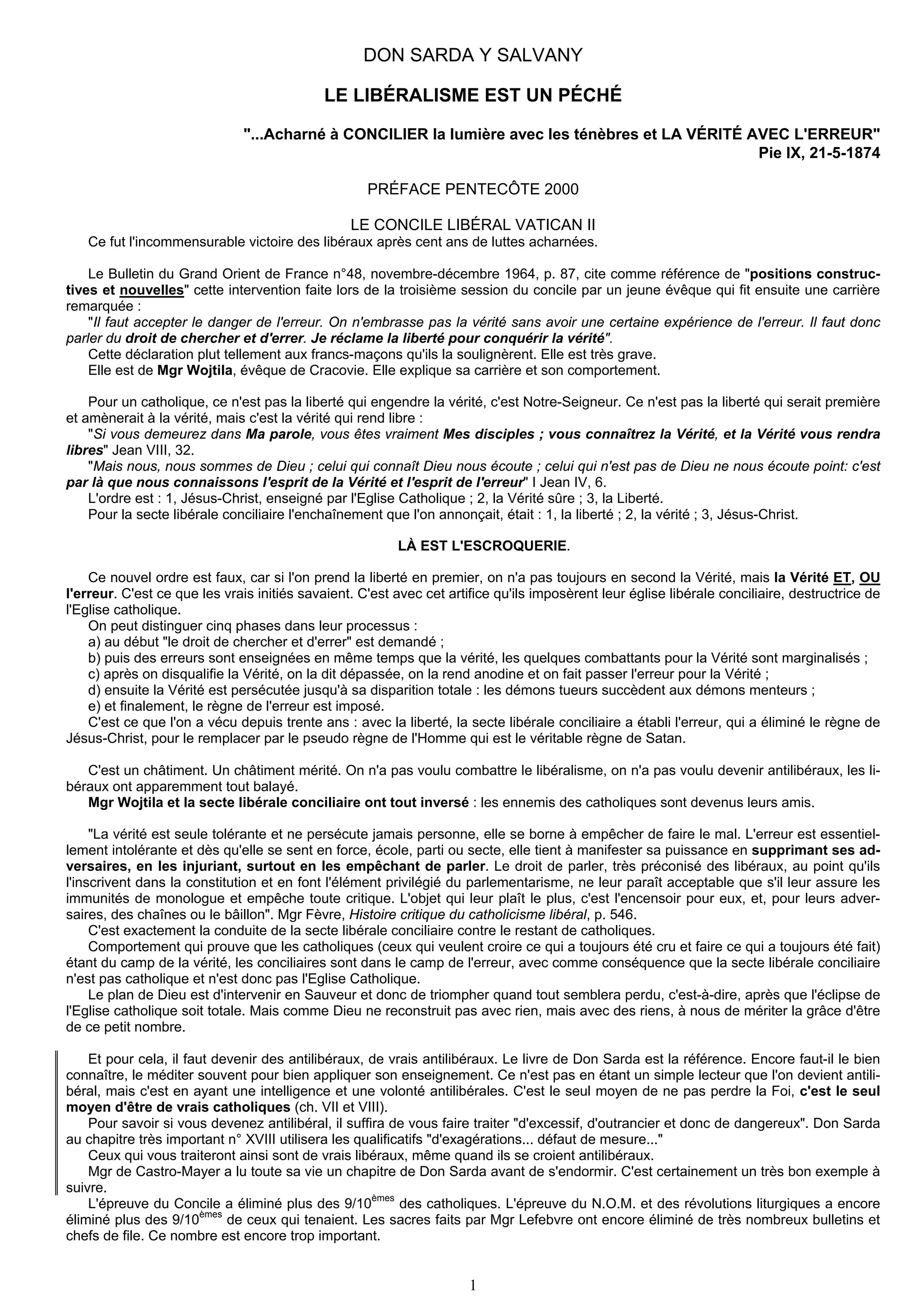 Le document argue que le libéralisme est considéré comme un péché dans le catholicisme, en soulignant que les erreurs libérales sont progressivement acceptées par l'Église, ce qui a conduit à la déformation de la vérité chrétienne. Il expose un processus en cinq étapes de dégradation de la vérité, culminant dans l'imposition de l'erreur, et affirme que ceux qui défendent la vérité doivent devenir antilibéraux pour préserver leur foi. Enfin, le texte conclut sur la nécessité de revenir aux enseignements de Don Félix Sardà y Salvany pour contrer l'influence du libéralisme dans l'Église et la société.