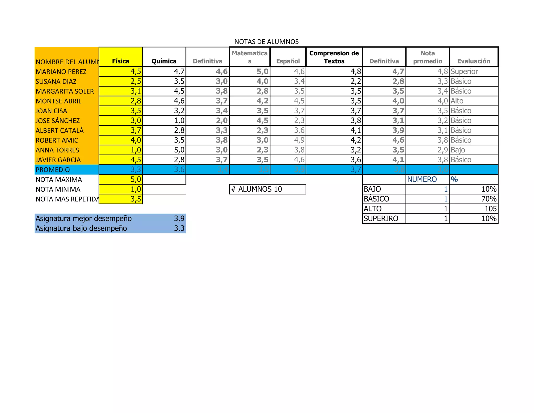 Le document présente les notes de 10 élèves dans plusieurs matières, indiquant leurs performances respectives. Leurs moyennes et les notes maximales et minimales sont également fournies, ainsi que des statistiques sur les performances globales. En général, les élèves montrent des résultats variés, avec plusieurs classés en niveau 'básico' et d'autres 'superior'.
