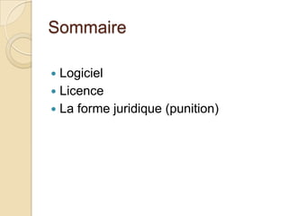 Le document traite des licences de logiciels, en expliquant les différents types, tels que la licence fixe, nominative, flottante, et libre, ainsi que leur réglementation au Maroc. Il aborde également la création de logos et leur importance dans l'identification d'entités. Enfin, il mentionne les lois marocaines relatives à la protection des droits d'auteur et des données personnelles.