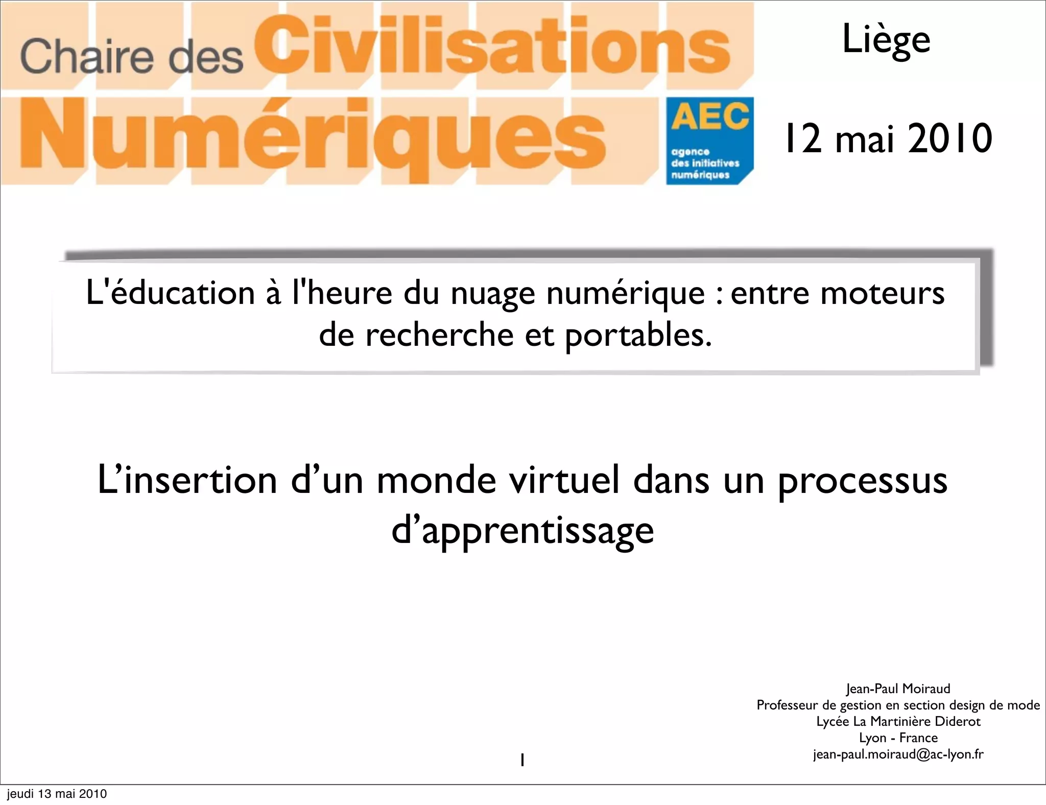 Le document discute de l'intégration des mondes virtuels dans l'éducation, en examinant les enjeux pédagogiques, techniques et organisationnels. Il met en avant l'importance de choisir un environnement virtuel adapté pour favoriser l'apprentissage collaboratif et individualisé. L'auteur propose également des réflexions sur la formation des enseignants et des apprenants dans ce contexte numérique.