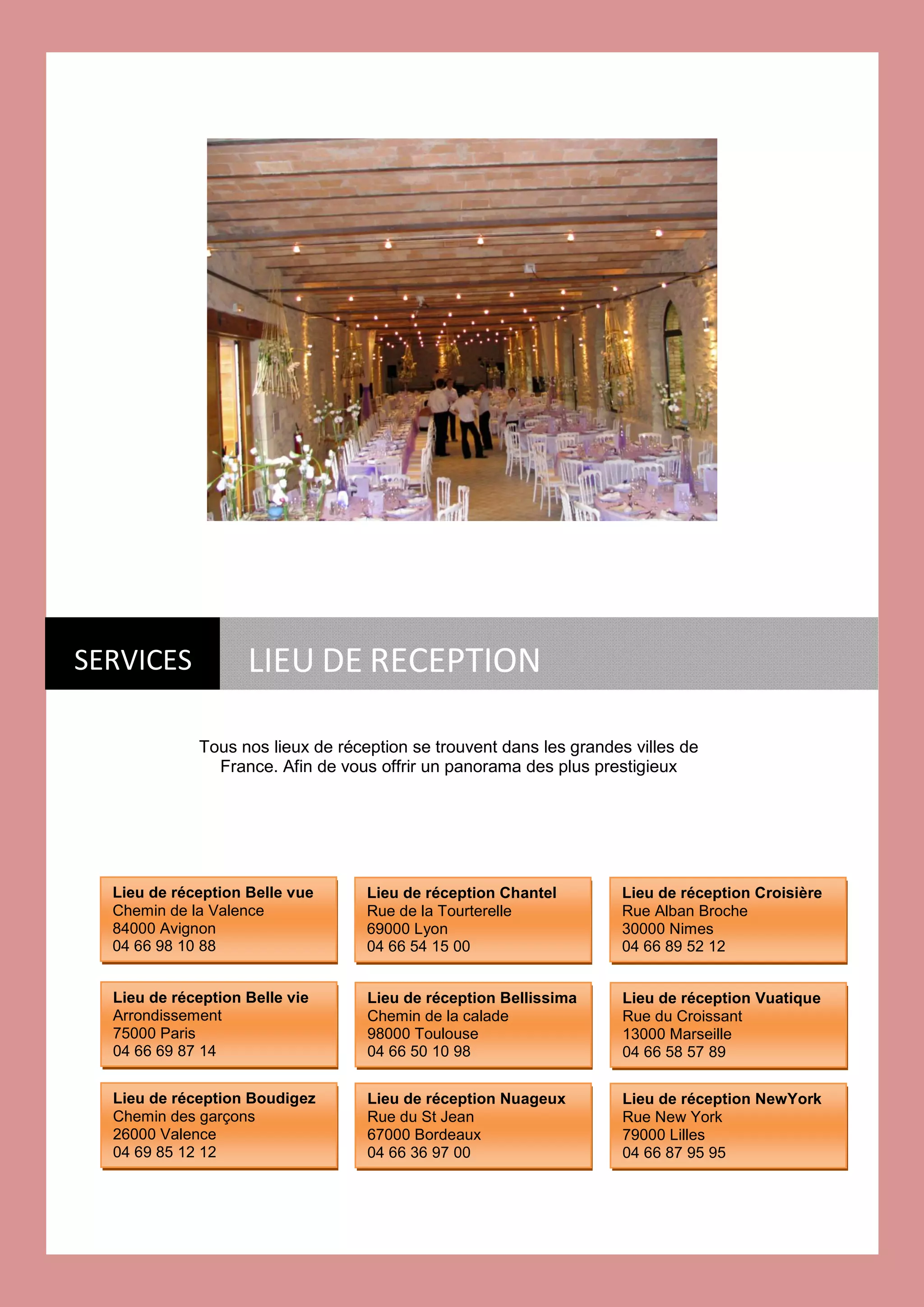 Le document décrit les différents lieux de réception disponibles dans les grandes villes de France. Il mentionne plusieurs sites spécifiques à Avignon, Lyon, Nîmes, Paris, Toulouse, Marseille, Valence, Bordeaux et Lille, accompagnés de numéros de contact. Ces lieux se distinguent par leur prestige et leur vue.