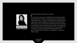 Le document présente une analyse des stratégies marketing innovantes utilisées par diverses marques, telles que Lufthansa, Louis Vuitton, et KFC, pour se démarquer dans un paysage commercial concurrentiel. Des initiatives créatives, allant d'expositions artistiques à des programmes en ligne interactifs, sont mises en avant, illustrant comment ces entreprises tentent de capter l'attention des consommateurs tout en renforçant leur image de marque. En outre, des entreprises comme DHL et Tissot adaptent leurs offres pour répondre aux exigences du secteur du luxe et aux tendances du marché.