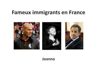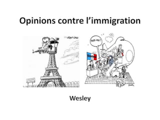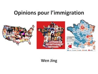Le document aborde les questions d'immigration en France, en définissant les termes clés et en présentant des statistiques sur les immigrés par pays d'origine. Il expose des opinions pour et contre l'immigration, en soulignant ses avantages économiques et culturels tout en mentionnant les craintes liées à la surpopulation et à la concurrence sur le marché de l'emploi. De plus, il cite des exemples d'immigrés célèbres et évoque des problèmes contemporains liés à l'immigration clandestine.