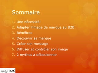 Le séminaire aborde l'importance de la marque en B2B pour les travailleurs autonomes, PME et grandes entreprises, soulignant la nécessité d'adapter l'image de marque et de comprendre les bénéfices associés. Il présente trois étapes clés pour construire une image de marque : découvrir sa marque, créer son message et le diffuser. Enfin, il déconstruit deux mythes sur la propriété et l'autonomie de la marque dans le contexte B2B.