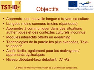 Le projet lingu@com, financé par la Commission européenne, vise à faciliter l'apprentissage des langues moins connues à travers un apprentissage interculturel et des technologies avancées comme le text-to-speech. Il cible principalement les jeunes adultes, incluant ceux ayant des difficultés visuelles ou dyslexiques, en proposant des modules e-learning interactifs adaptés à divers styles d'apprentissage. Les partenaires incluent plusieurs universités européennes et se concentrent sur une approche didactique contrastive pour améliorer la communication dans des contextes culturels authentiques.