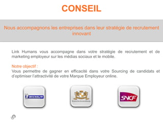 Link Humans est une entreprise spécialisée dans le conseil et la formation en recrutement innovant, aidant les entreprises à optimiser leur stratégie de sourcing et leur marque employeur sur les médias sociaux. Ils proposent des formations en sourcing, community management et marketing employeur, ayant déjà formé plus de 300 professionnels dans le domaine. De plus, ils organisent des événements tels que le #rmsconf et le #truparis pour promouvoir le recrutement innovant en France.