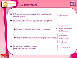 Le document aborde l'importance de l'intelligence économique (IE) pour les PME et la nouvelle mission des experts-comptables dans ce domaine, notamment la mise en place d'organisations et d'alertes professionnelles. Il présente également des questionnaires offensifs et défensifs pour évaluer la sensibilité des entreprises à l'IE, ainsi que des méthodes de recherche d'informations et d'alertes. Enfin, il discute des exigences de financement pour ces nouvelles missions et des critères de risque pour la santé financière des entreprises.