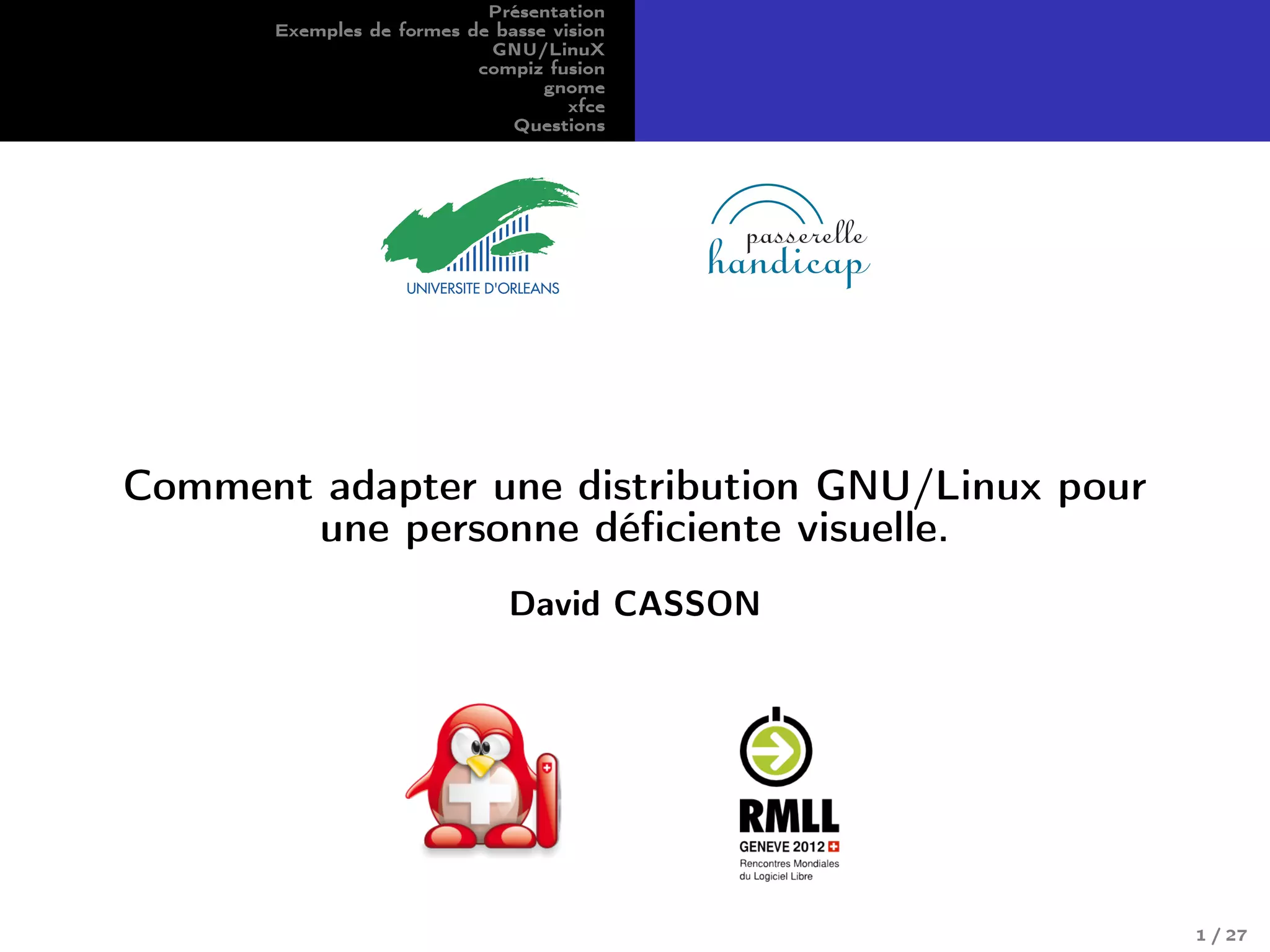 Le document présente des adaptations de distributions GNU/Linux pour les personnes déficientes visuelles, abordant des formes de basse vision comme l'amblyopie, la dégénérescence maculaire, la rétinopathie diabétique, le glaucome, la rétinite pigmentaire et la cataracte. Il décrit les quatre libertés associées à GNU/Linux et fournit des conseils pratiques, comme désactiver les effets graphiques et utiliser des thèmes de bureau compatibles, notamment avec Orca. Cette présentation inclut également des exemples de gestionnaires de fenêtres et de bureaux adaptés aux besoins des utilisateurs malvoyants.