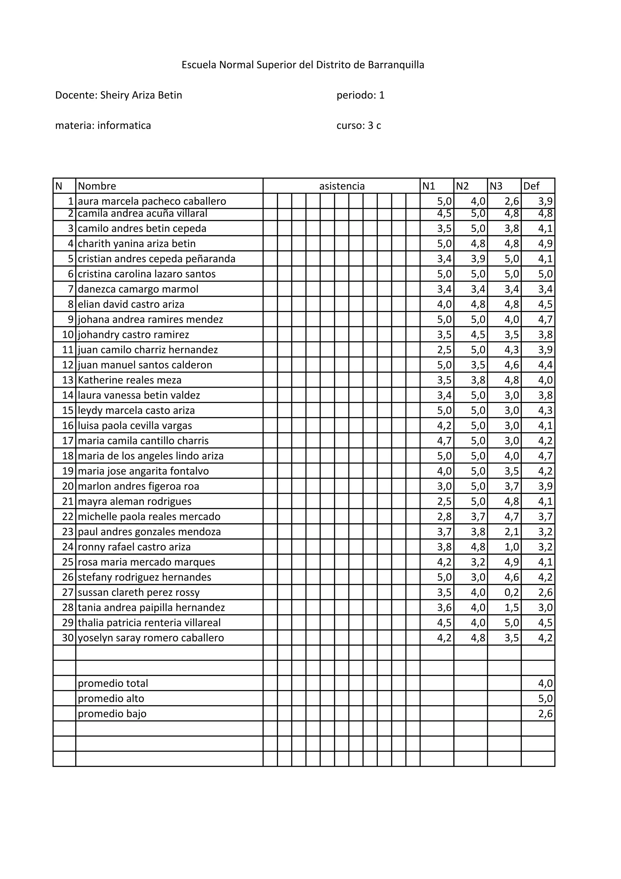 Le document présente les notes d'élèves en informatique pour le premier trimestre d'une classe de 3ème. Les résultats incluent des scores individuels pour chaque élève ainsi que des moyennes générales, avec un score moyen total de 4,0, un score moyen élevé de 5,0 et un score moyen bas de 2,6. Les données proviennent de l'École Normale Supérieure du District de Barranquilla.