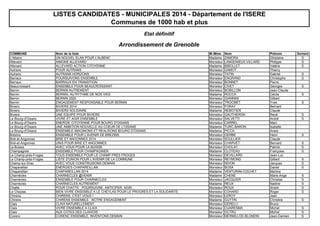 Le document énumère les listes de candidats pour les élections municipales de 2014 dans différentes communes du département de l'Isère. Chaque entrée présente le nom de la commune, le nom de la liste, le nom et prénom du candidat sortant ainsi que le slogan ou la description de leur candidature. Il met en avant la diversité des projets et initiatives proposées par les candidats pour améliorer leurs communes.