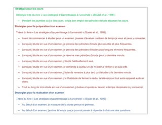 Le document présente une série de stratégies de gestion du temps, des ressources humaines et matérielles, ainsi que des méthodes d'apprentissage efficaces pour les étudiants, tirées de différents ouvrages. Ces stratégies incluent la planification, l'organisation, la concentration, la gestion de l'anxiété et la motivation dans le cadre des études et de la préparation aux examens. L'accent est mis sur l'importance du travail autonome, de l'évaluation continue et de l'adaptation des méthodes d'apprentissage pour optimiser la performance académique.