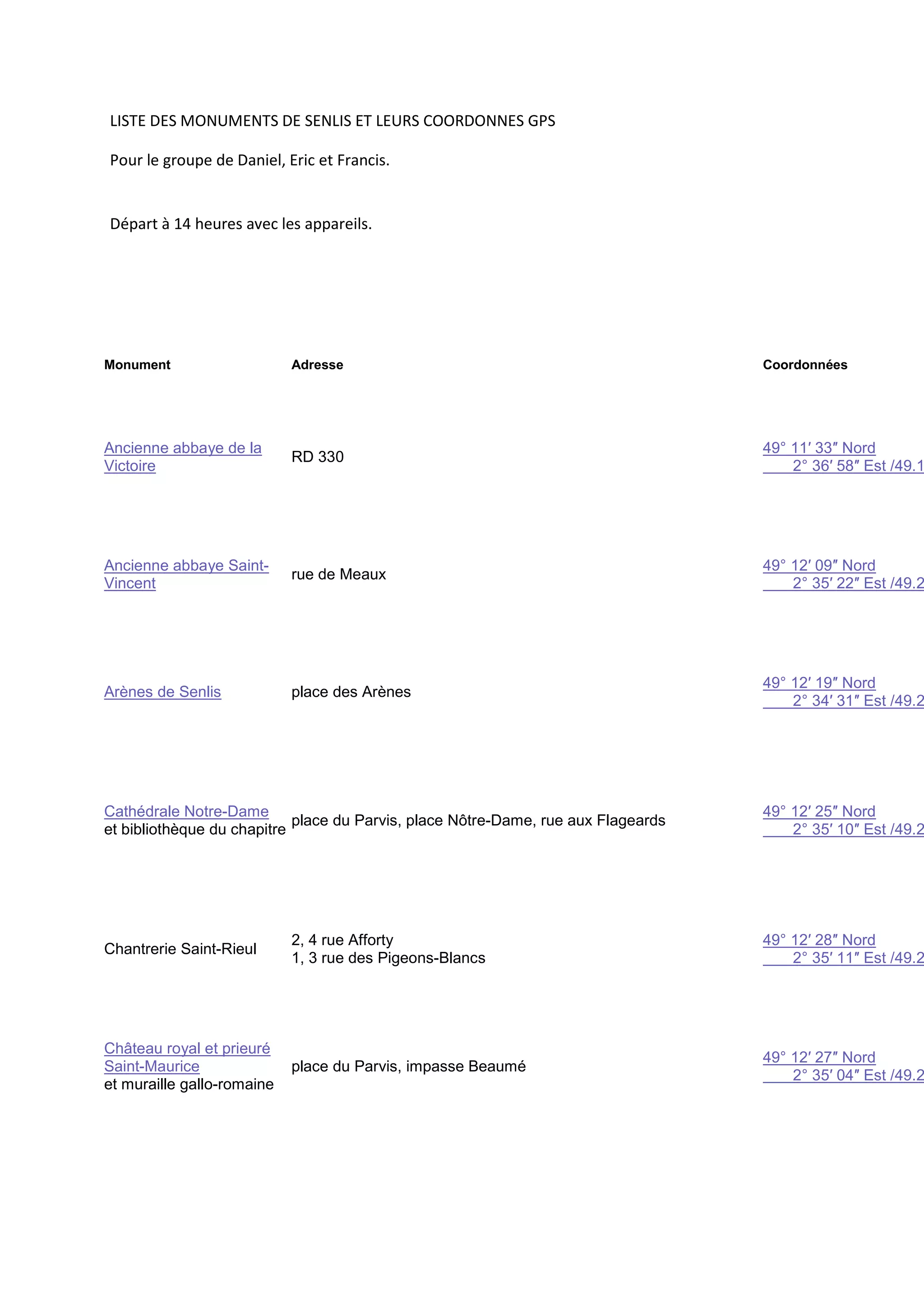 Le document fournit une liste des monuments de Senlis, y compris leurs adresses et coordonnées GPS, pour un groupe de personnes prévu pour un départ à 14 heures. Les monuments incluent des sites historiques tels que l'ancienne abbaye de la victoire, la cathédrale notre-dame, et l'hôtel de ville. Les coordonnées GPS sont détaillées pour chaque monument afin de faciliter la visite.